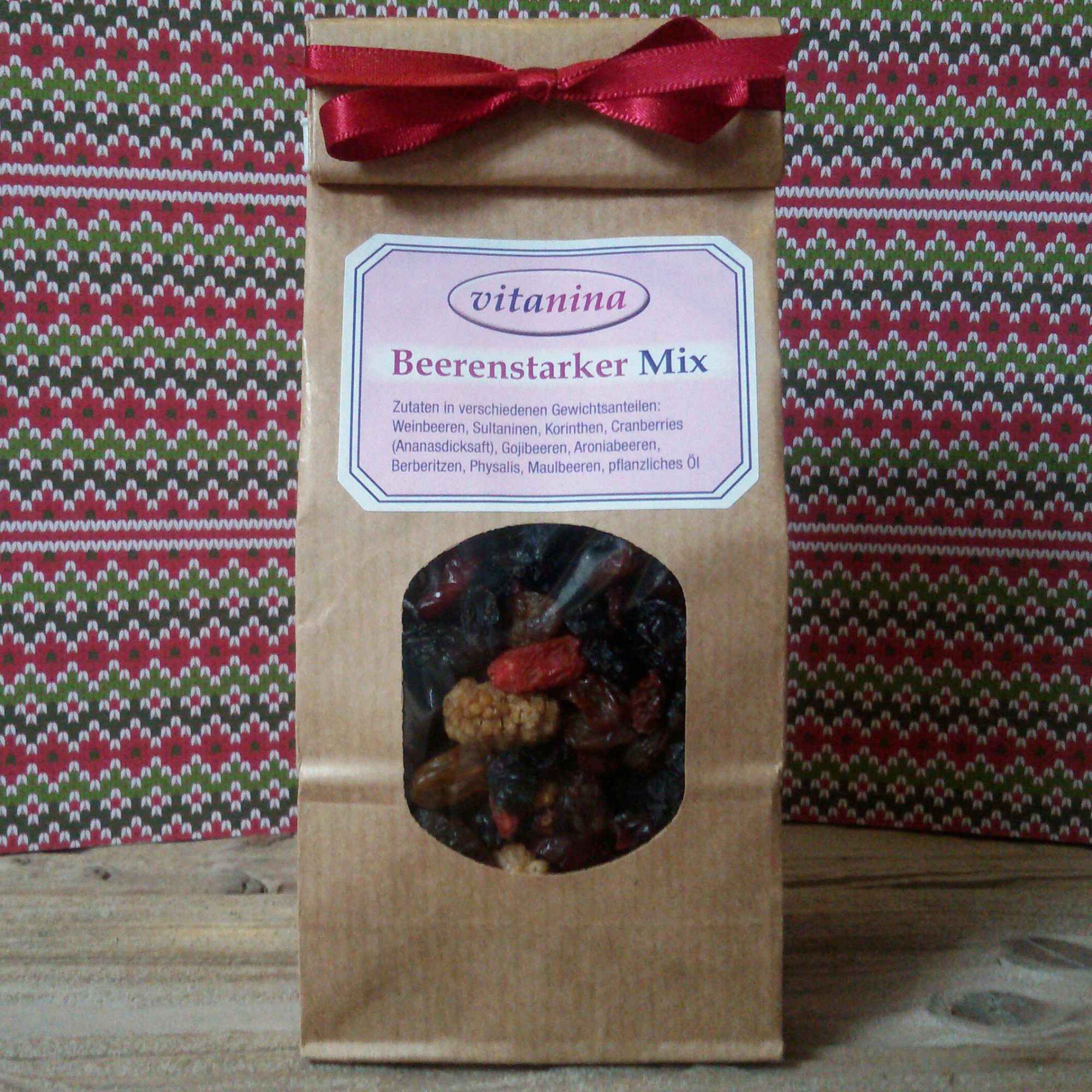 Der Beerenstarke Mix ist eine ausgesuchte getrocknete Beerenmischung für Schleckermäuler und Kraftfutter für Alle, die beerenstark den Tag meistern. Er schmeckt in Müslis, Desserts und feinen Kuchen, aber auch in Spinat und Sauerkraut, oder einfach als Snack.